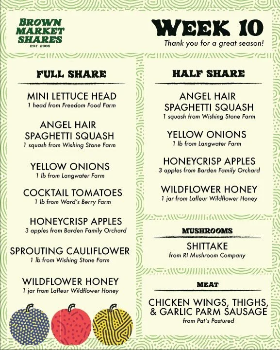 The Brown Market Shares Program (BMSP) is a student-run, campus-based food distribution program connecting the College Hill community with regional producers through affordable weekly shares of local and sustainable produce, bread, mushrooms, eggs, dairy, and meat.