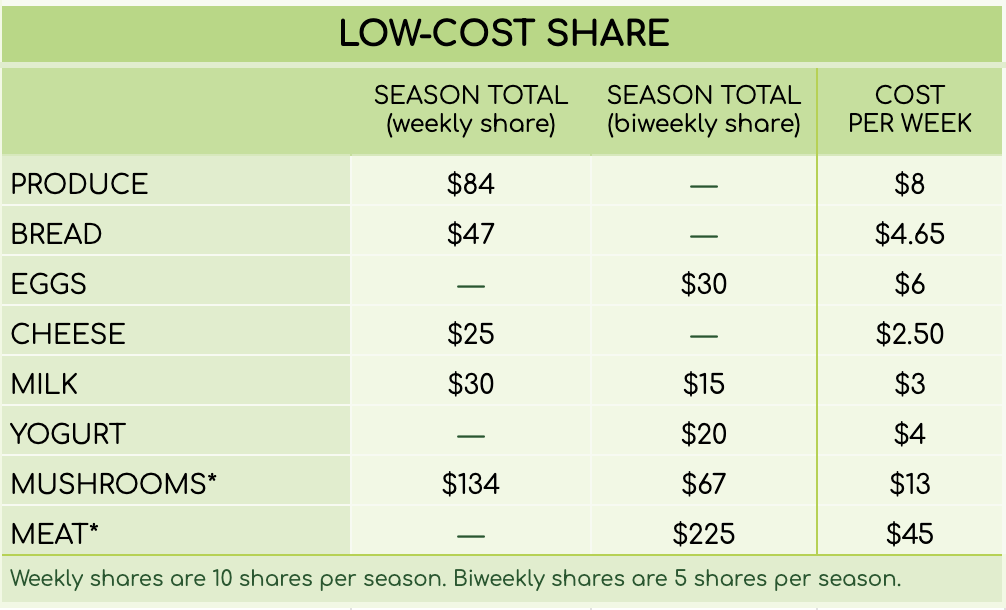 *Please note that we do not subsidize the cost of mushrooms and meat—you can still purchase them, but the price listed is the same as our full-cost share.