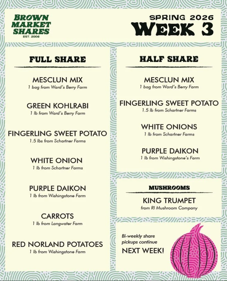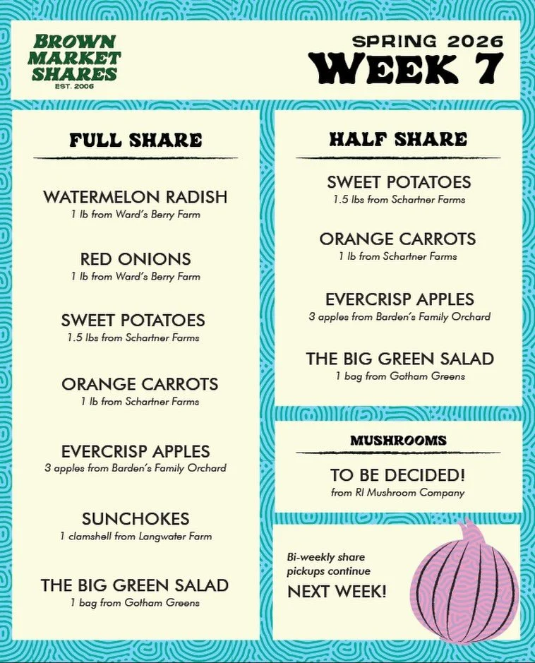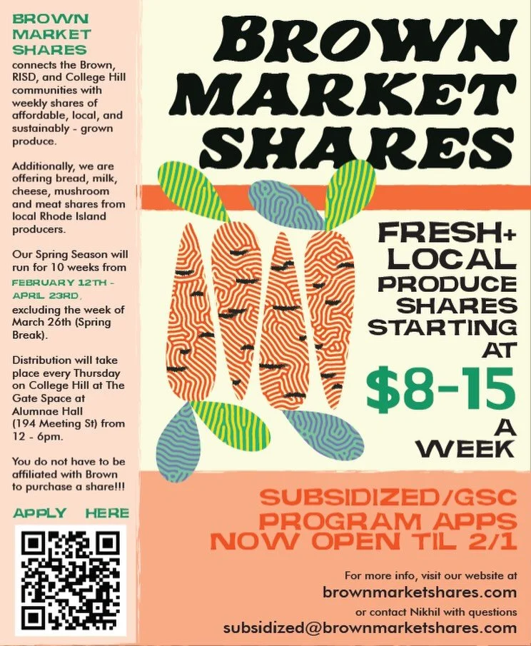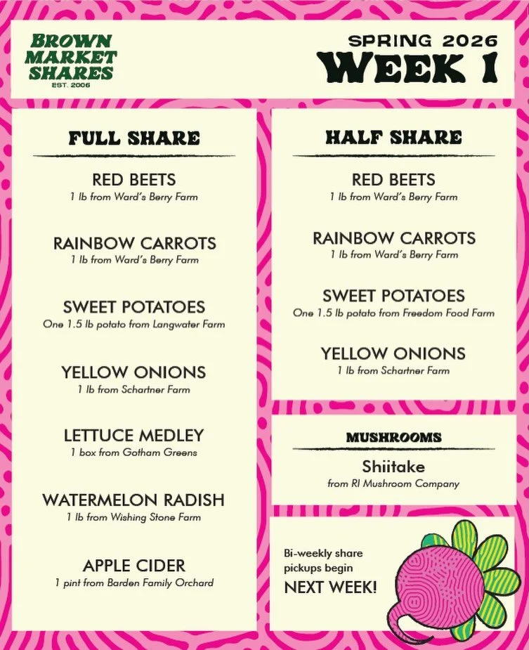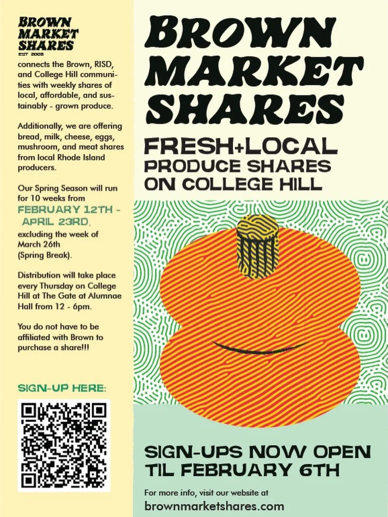 The Brown Market Shares Program (BMSP) is a student-run, campus-based food distribution program connecting the College Hill community with regional producers through affordable weekly shares of local and sustainable produce, bread, mushrooms, eggs, dairy, and meat.
