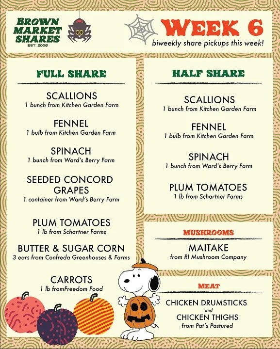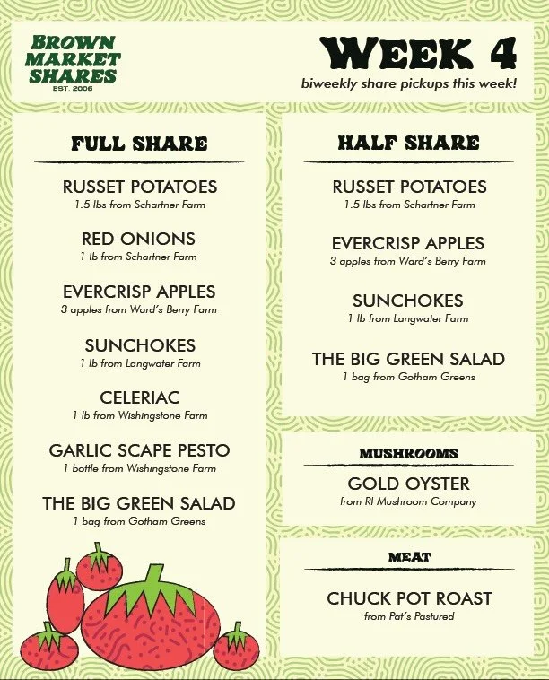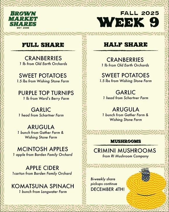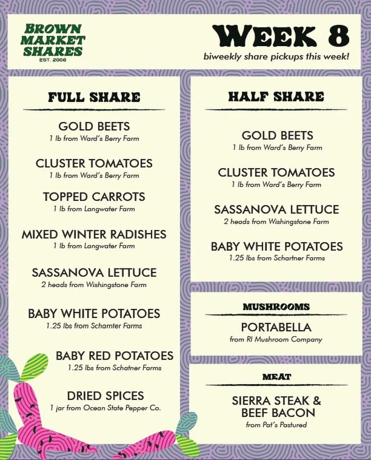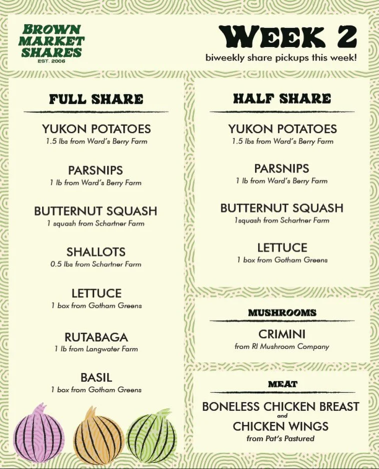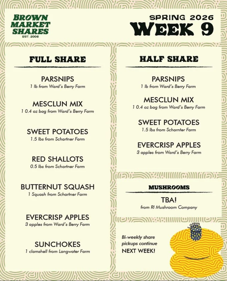 The Brown Market Shares Program (BMSP) is a student-run, campus-based food distribution program connecting the College Hill community with regional producers through affordable weekly shares of local and sustainable produce, bread, mushrooms, eggs, dairy, and meat.