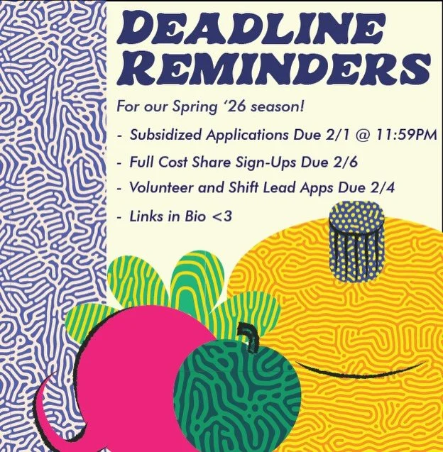 Our Market Day now operates out of The Gate at Alumnae Hall (194 Meeting St) on Thursdays, where you can come by and pick up your share from 12-6pm.